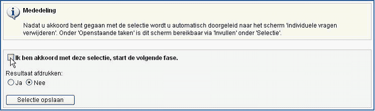 5.De gebruiker vinkt vervolgens Ik ben akkoord met de selectie, start de volgende fase aan en klikt op de knop Selectie opslaan.
