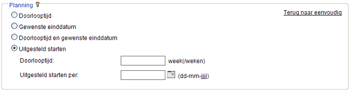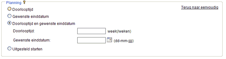 Als u in het kader Planning op geavanceerd klikt, komen de onderstaande extra planningsmogelijkheden beschikbaar: •Doorlooptijd en gewenste einddatum (niet aanbevolen) Als u voor deze planning kiest, wordt de startdatum van het actiepunt de gewenste einddatum minus de doorlooptijd. ode startdatum voor de datum ligt waarop de RI&E definitief wordt vrijgegeven. In dat geval wordt de startdatum gelijk aan de vrijgavedatum. ode gewenste einddatum voor de datum ligt waarop de RI&E definitief wordt vrijgegeven. In dat geval wordt de startdatum én de einddatum gelijk aan gewenste einddatum. •Uitgesteld starten (niet aanbevolen) Als u voor deze planning kiest, wordt de einddatum de door u opgegeven startdatum plus de doorlooptijd. Let op: het is dan mogelijk dat: oDe startdatum voor de datum ligt waarop de RI&E definitief wordt vrijgegeven. In dat geval wordt de startdatum gelijk aan de vrijgavedatum. oDe startdatum en de berekende einddatum voor de datum ligt waarop de RI&E definitief wordt vrijgegeven. In dat geval wordt de startdatum én de einddatum gelijk aan de berekende einddatum. |