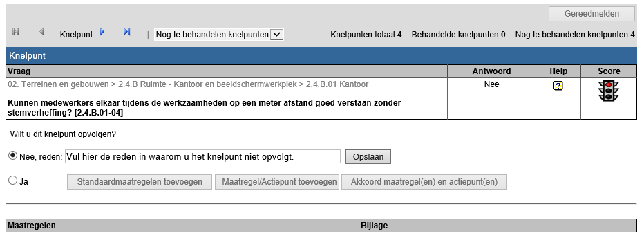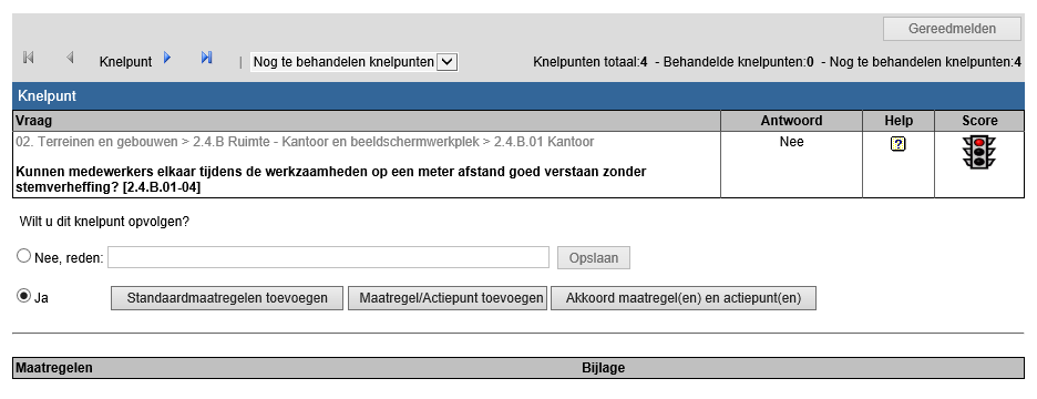 Om de fase Maatregelen en Actiepunten (gecombineerd) af te ronden dient u allen knelpunten behandeld te hebben. Rechtsboven is de knop Gereedmelden beschikbaar.