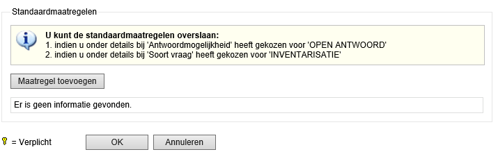 << Klik voor de index >> Navigatie: Beheerder > Vragenlijstbeheer > Vragen > Toevoegen van standaardmaatregelen |