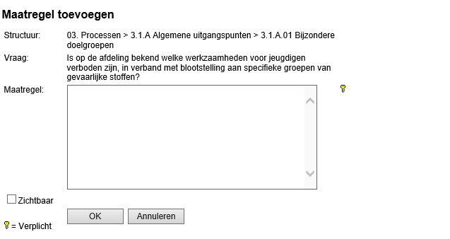 Als u een vinkje plaatst bij Zichtbaar, dan is de Vraag dan wel de Standaardmaatregel zichtbaar bij de Coördinator(en) en zijn Gebruikers. Indien u dit vinkje (nog) achterwege laat, kunt u eventueel eerst uw verwante werkzaamheden afronden alvorens het proces/aspect/vraag/standaard maatregel beschikbaar te stellen aan de Coördinator(en) en zijn gebruikers.