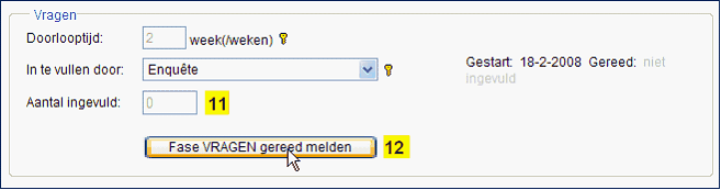 12. Indien er voldoende enquêtes zijn ingevuld, kunt middels de knop Fase VRAGEN gereed melden de enquête beëindigen.