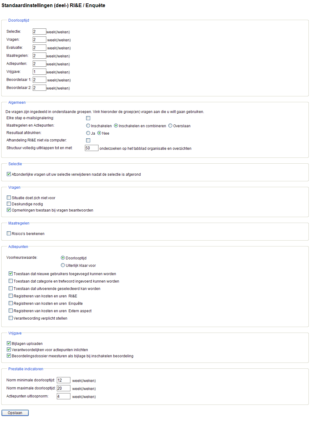 Hier kunt u de standaardinstellingen bepalen die u moet ingeven bij het uitzetten van een RI&E of enquête.