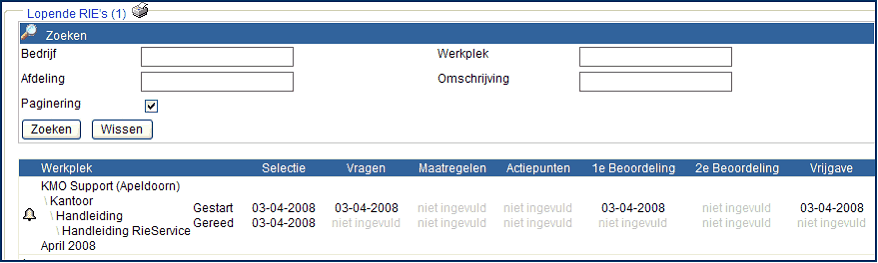 Indien een RI&E zich in de eerste of tweede beoordeling bevindt, kan het statusscherm zo op het oog ‘rare’ datums weergeven. Denk daarbij aan een startdatum bij de fasen beoordeling en vrijgave, terwijl er plotseling geen datums meer staan vermeld bij de fases maatregelen en/of actiepunten: