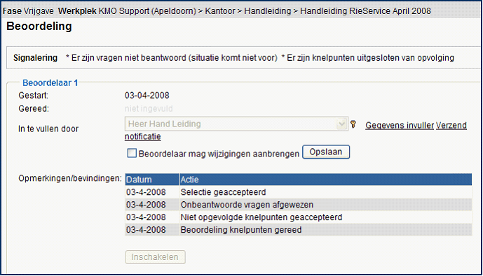 Bedenk in een dergelijk geval dat de beoordelaar een RI&E kan afkeuren, en naar een eerdere fase in de RI&E. Door de informatie die vermeld staat in het vrijgave scherm juist te interpreteren, in combinatie met de datums in het statusscherm, kunt u bepalen in welke fase de RI&E zich bevindt en waarom.