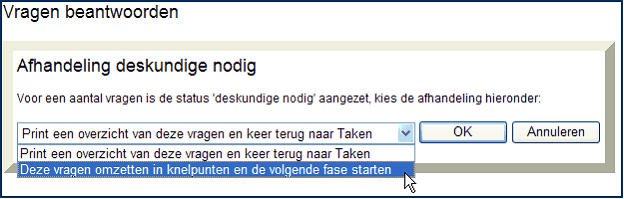 •een lijst met alle vragen die dit antwoord hebben gekregen af te drukken. U kunt dan d.m.v. onderzoek/ruggespraak alsnog de juiste antwoorden achterhalen. Nadat u de antwoorden heeft achterhaald, kunt u de vragen alsnog van het juiste antwoord voorzien en de fase gereed melden.