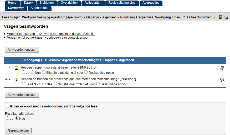 8.Als u alle vragen heeft beantwoord en u wilt geen wijzigingen meer aanbrengen, dan dient u eventuele vervolgvragen te beantwoorden en uw taak gereed te melden. De volgende fase in de (deel)RI&E wordt dan gestart. Klik daarvoor op Antwoorden Opslaan en een vervolgscherm wordt getoond.