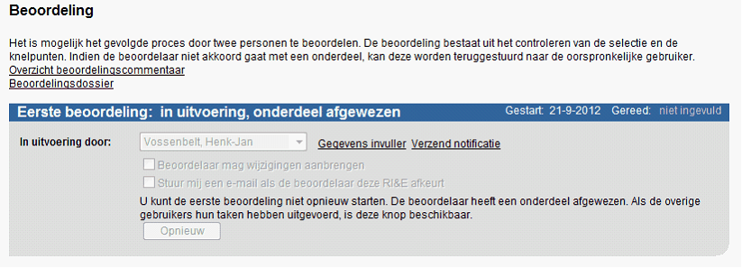 Als de Beoordelaar een RI&E heeft afgekeurd en de RI&E opnieuw bij de oorspronkelijke gebruiker is, is de knop Opnieuw niet beschikbaar. Op het moment dat de oorspronkelijke gebruikers hun werkzaamheden hebben afgerond en de beoordeling van de RI&E door de Beoordelaar kan worden hervat, is de knop weer geactiveerd: