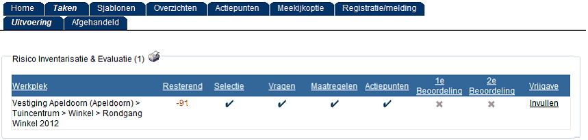 Nadat door de gebruiker van de vorige fase (gebruiker 5) de actiepunten zijn aangemaakt en toegewezen aan uw collega's, komt u in het tabblad Vrijgave. In dit tabblad gaat u beslissen of u de uitgevoerde RI&E wilt (laten) beoordelen of dat u de RI&E wilt vrijgeven. Indien u al een Beoordeling heeft gestart, is dit ook in dit overzicht zichtbaar onder het kopje Beoordeling. Er zijn maximaal twee beoordelingen mogelijk per deel-RI&E/enquête.
